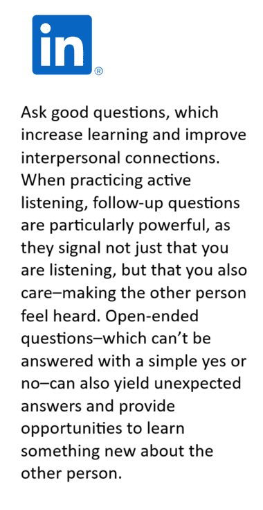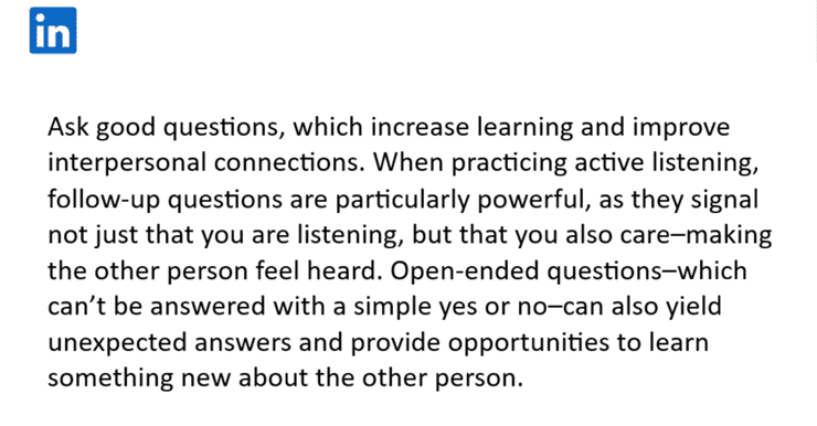 Finalmente, haces preguntas poderosas, parafraseas y usas tu lenguaje no verbal para demostrar que estás escuchando activamente, por ejemplo, haces contacto visual y asientes con la cabeza.