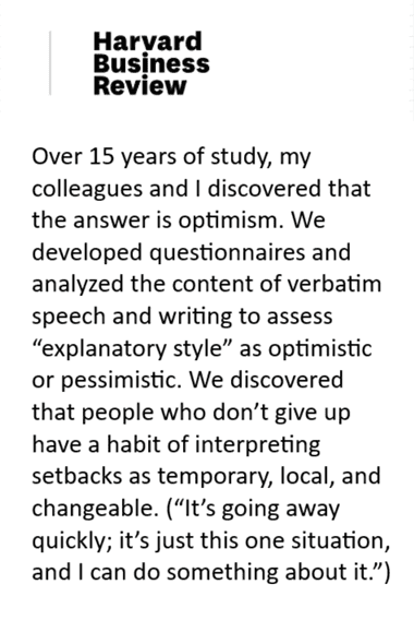 Durante 15 años de estudio Seligman y sus colegas descubrieron que las personas resilientes son optimistas, que no se rinden y que interpretan los contratiempos o recaídas como situaciones temporales, locales (específicas) y cambiantes.