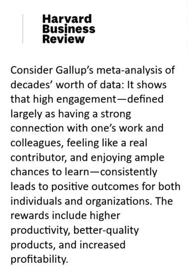 Las investigaciones de Gallup demuestran que tener una fuerte conexión con las personas con quienes trabajas es uno de los aspectos que genera un alto compromiso y que produce resultados positivos, como por ejemplo una mayor productividad, productos de mejor calidad y una mayor rentabilidad.