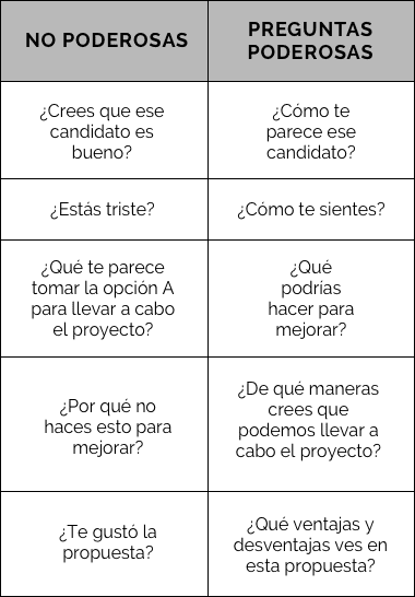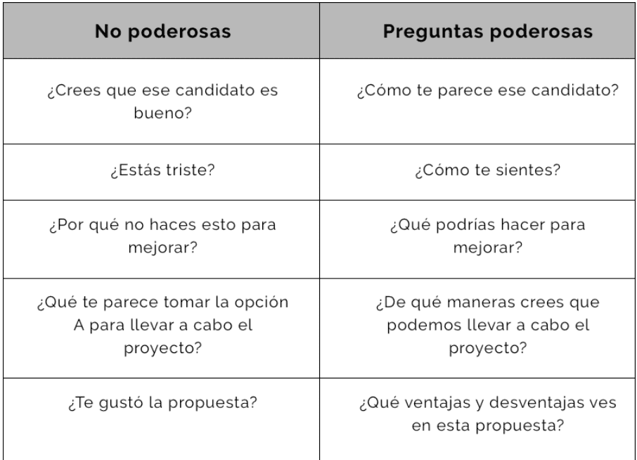 También puedes hacer una pregunta poderosa para que la persona siga profundizando, y que te permita entender más a fondo cómo piensa y siente.