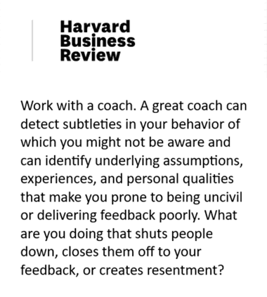 Harvard Business Review también sugiere que trabajes con un coach certificado ya que los coaches podemos detectar sutilezas en tu comportamiento de las que quizás no eres consciente y ayudarte a identificar y transformar eso que te impide comunicarte y relacionarte de forma efectiva con otros.