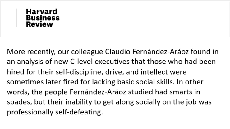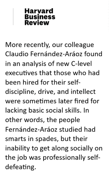 De hecho, según investigaciones realizadas por Claudio Fernández-Aráoz, profesor de la Escuela de Negocios de Harvard, los altos ejecutivos que habían sido contratados por su autodisciplina, impulso e intelecto, fueron despedidos por carecer de habilidades sociales.